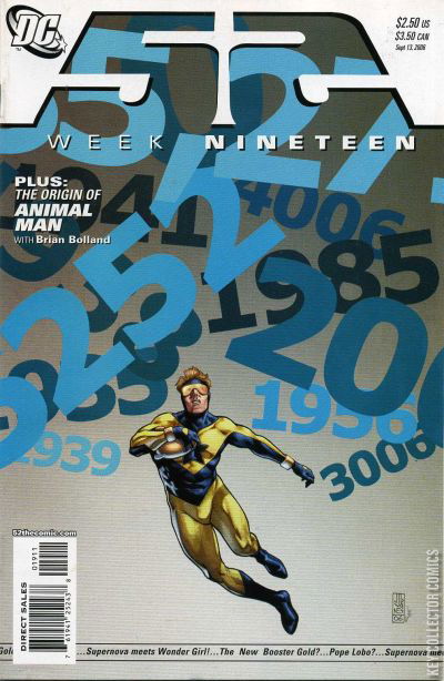 WEEK 19: "What if I told you I could — using Booster's DNA— bioengineer a superhero identity for you?" Plus, the Origin of Animal Man by Waid and Brian Bolland! 52: A year without Superman; a year without Batman; a year without Wonder Woman…but not a year without heroes.