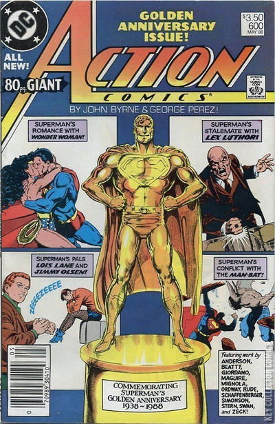 DIFFERENT WORLDS / TRUE LOVE / GAMES PEOPLE PLAY / A FRIEND IN NEED / THE DARK WHERE MADNESS LIES Cover pencils by John Byrne, Kurt Schaffenberger, Dick Giordano, Curt Swan, and Mike Mignola, inks by George Perez, Jerry Ordway, John Beatty, Murphy Anderson, and Mike Mignola. Alternate Action Comics #600 cover, pencils by John Byrne, inks by George Perez. "Different Worlds!" script by John Byrne, pencils by John Byrne (breakdowns) and George Perez (finishes), inks by George Perez; Hermes summons Wonder Woman to Olympus from her romantic meeting with Superman, and the Man of Steel follows, but they arrive in different locations; After Hermes explains to Diana that Olympus has been taken over by Darkseid, the New God toys with the heroes, making them battle, as he discusses with Desaad his plans. "True Love!" script by John Byrne (plot) and Roger Stern (script), pencils by Kurt Schaffenberger, inks by Jerry Ordway; Lois is upset that the papers are saying that Superman and Wonder Woman are dating. "Games People Play!" script by John Byrne, pencils by Dick Giordano, inks by John Beatty; Lex threatens to reveal to the public that Maggie is a lesbian; Lex learns that he has kryptonite poisoning. "A Friend in Need!" script by John Byrne (plot) and Roger Stern (script), pencils by Curt Swan, inks by Murphy Anderson; Superman goes to Millersburg to answer Jimmy's signal watch, but weakens from kryptonite poisoning. "The Dark Where Madness Lies!" starring Superman and Man-Bat, script by John Byrne, pencils by Mike Mignola, inks by Mike Mignola. Comics Buyer's Guide Fan Awards for 1987. Kevin MaguireDave Gibbons, Walt Simonson, and Mike Zeck pin-ups; Art Adams pin-up inks.