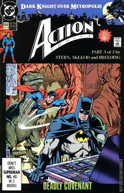 Cover art by Kerry Gammill and Brett Breeding. Part Three: Dark Knight Over Metropolis starring Superman and Batman, script by Roger Stern, pencils by Bob McLeod, inks by Brett Breeding; Superman and Batman team up against Ugly Mannheim's assassins, Superman gives Batman the kryptonite ring.