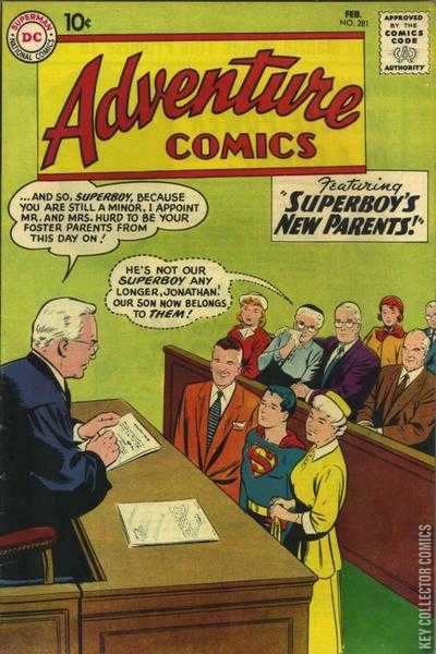 Superboy in "Superboy's New Parents" (12 pages) When Superboy testifies in a case against a juvenile delinquent, a note is delivered to the judge accusing Superboy of being a minor without parents. The judge refuses to accept Superboy’s explanation that he can’t reveal his adoptive parents, and Superboy is to be sent to a boys home. A Smallville couple, the Hurds, step forward and request to adopt Superboy. The judge agrees to allow it as a provisionary adoption. The Hurds then use Superboy’s notarioty to make money for themselves. Superboy learns of their plan and schemes to stop them. After making their lives miserable for a few days, the Hurds gladly give Superboy up. The judge again wants to send Superboy to live at a boys home. However, a town committee proves Superboy is more intelligent and stronger than any adult and should be treated as such. The judge agrees, and Superboy is declared an adult. Congo Bill in "The Lost Magic Ring" (13 pages)