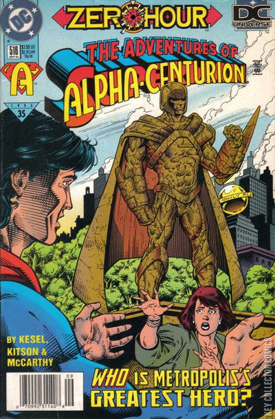 Superman Triangle #35 for 1994. A Zero Hour crossover issue. With the events of Zero Hour unfolding, Superman finds himself transported to an alternate version of Metropolis. In this Metropolis, Lois Lane does not recognize Clark Kent, and the city is protected by Alpha Centurion. Superman teams up with Alpha Centurion to defeat the Centurion’s arch-enemy, Bloody Mary. Superman brings a wounded Alpha Centurion back to his headquarters, where he reveals his origin: he was a Roman captured by space aliens, learned their technology, then was returned to Earth thousands of years later. Using alien tech, Alpha Centurion became the greatest hero of his world. After a bath in “aquavitae” to heal his wounds, Alpha Centurion introduces Superman to his wife Lois. Superman reveals that he is actually from an alternate timeline, and recruits Alpha Centurion to help fight against the Zero Hour time rifts.
