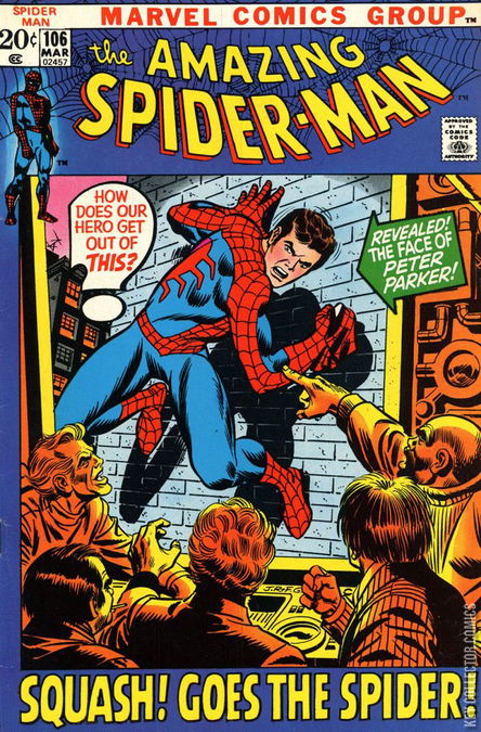 SQUASH GOES THE SPIDER! Spider-Man notices a security camera recording him changing back into Peter Parker and webs it up, however, he is too late as Spencer Smythe (who had taken control of the camera) had already taken a picture of Spider-Man's real face. Deciding to err on the side of caution, Spider-Man pays a visit to Curt Connors and uses his lab to create a synthetic mask based on his own face to try and reverse any potential compromise the camera has caused his secret identity. As news about the theft of the control device to the police's security cameras gets out to the Bugle, Smythe invites various underworld types to try to get them to buy his services. He reveals to them that thanks to his brilliance he has learned the secret identity of Spider-Man. However, when he trains the camera on Spider-Man again, the wall-crawler is ready with his synthetic Parker mask and takes it off in front of the camera, which discredits Smythe. However, Smythe offers to make it up by attacking Spider-Man in his new Spider-Slayer model, which is piloted by himself. Meanwhile, Spider-Man spots another protest happening in front of the police station, the people there are protesting the privacy invasion caused by the polices cameras. Surprisingly enough, J. Jonah Jameson is in the crowd lending his support. Spider-Man pops in and tells them that he agrees with them before slinging off and returning to his civilian identity. He briefly checks in on Harry when Mary Jane and other revelers come with pizza. When Mary Jane asks Peter he's in he tells her that he's got a date with Gwen. When Peter meets up with Gwen, he learns that they aren't going out on a date so much as checking in on Flash Thompson, who Gwen is worried about since he's come back from Vietnam. When Flash Thompson loses his temper over their concern, the couple decides to leave him be and go out for a romantic evening together. After his date with Gwen is over, Peter changes into Spider-Man, when he detects that he's being monitored by the security cameras, he soon finds out who's been watching when he's attacked by Smythe in his new Spider-Slayer robot.