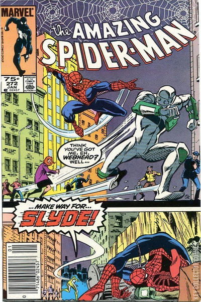 MAKE WAY FOR SLYDE! A new costumed villain known as Slyde is making his criminal debut by robbing a bank. With his slick body suit he is able to skate across the floor to the teller window in moments. After robbing the teller at gunpoint, Slyde is confronted by the guards. Unphased by this, Slyde tosses his gun away and slides right through them and out the window and into the street. Meanwhile, elsewhere in town, Spider-Man is busting up a shady poolhall to learn who was responsible for beating up Nathan Lubenski the night before. However, before he can get any answers he is chased out by the owner. As he swings away the wall-crawler blames himself for not being there to protect Nathan and likens it to the death of his Uncle Ben, something that happened because Spider-Man failed to act. On a rooftop, Spider-Man wonders why he can't even save the people he cares about and angrily punches a chimney. Hearing sirens, Spider-Man decides to go and check it out in the hopes it gets him photos good enough to sell to the Daily Bugle. A few blocks away, Slyde manages to keep a step ahead of the cops thanks to his non-stick costume. Evading them, he manages to force the cops into crashing into an oncoming vehicle. That's when Spider-Man arrives on the scene and tries to stop Slyde by webbing him up, unfortunately, not even Spider-Man's webbing can cling to the fleeing criminal. Slyde manages to trip up Spider-Man, making him land in the back of a fruit truck. As he crawls out of the truck, he asks himself how things can get any worse. Looking in a shop window he sees a mannequin that resembles the Beyonder and hopes he won't run into the god-like being again, especially after their last encounter. With Slyde long gone, Spider-Man web-slings away and heads on to the hospital to see how Nathan is doing. At that moment, Slyde has escaped to his home where he celebrates his first outing as a costumed criminal. He thinks back to when he was Jalome Beacher, a chemical engineer working for the Beemont Manufacturing Company. It was there that he developed a new chemical coating. However, the company was soon bought out by a larger corporation owned by a man named Rockwall and Beacher soon found himself out of a job. When Jalome attempted to start his own business, the banks refused to grant him a loan. As such, he decided to use his new coating to get him the money he needed through crime. He now vows to make Rockwell pay for screwing with his life. Meanwhile, Peter Parker arrives at the hospital and learns from the doctors that the men who attacked Nathan didn't give him any lasting injuries, something Peter finds odd. When he goes in to check on Nathan, he gets a cold reception from Aunt May who is still upset with him for not watching after Nathan the night before. When Peter asks Nathan who attacked him, Lubenski tells Peter that he doesn't want him to get involved and that he doesn't want to think about it anymore. However, he looks at a bouquet of flowers sent by an "ominous" friend. At that moment, at the Beemont Manufacturing Company, Hawkins is gloating over how profitable his business is making him. Suddenly, Hawkins and his assistant Max hear a crash from one of the other rooms. When they go and check it out, they find Slyde. With nowhere to go, Slyde smashes out the window and decides to abort his petty revenge. Outside, he spots Maxwell trying to make a break for it with a briefcase. Seeing some value in it, Slyde snatches it from Maxwell and makes a break for it. Rockwell is furious because the records in that briefcase could ruin him. As Slyde makes his getaway, Peter Parker is walking his Aunt May to the bus. He apologizes to her again for not being there to protect Nathan. She tells Peter it's not his fault and supposes that family eventually drifts apart. The words cut Peter deep and he thinks it over as he watches the bus drive away. At that moment, Slyde has returned home and goes over the documents in Rockwell's briefcase. He finds two sets of papers, one that shows the Beemont losing money, while others show that the company is actually turning a profit and Rockwell is using it to launder money for the mob. Slyde considers turning over this information to the District Attorney but decides to use it for a more fitting revenge against Rockwell. Back at the Beemont office, Rockwell is expecting the thief to call and blackmail him. Sure enough, Slyde calls and demands a large sum of money in exchange for returning the papers. Rockwell makes arrangements but has no intention of paying the money, and orders Max to hire as many men as he can to eliminate Slyde and get the papers back. The following afternoon, Spider-Man happens upon some hoods in an alley marveling over the job they have been hired to do. As they flee, Spider-Man manages to snag one of them. He demands to know who attacked Nathan. However, the thug doesn't know anything about it, but spills all he knows about the hit taken out on Slyde. Spider-Man can't bring himself to stand by and allow someone get hurt, even a criminal like Slyde. The evening, as Slyde is making his exchange with Maxwell, Spider-Man silently takes out the hired guns. The exchange is made, and Maxwell orders his men to attack. While Spider-Man takes out the last of the guards, both Maxwell and Slyde try to make their escape. When Spider-Man tries to stop Maxwell's getaway car with a web-line, Slyde comes in and kicks out the tire. Before Spider-Man can stop Slyde, District Attorney Blake Tower and the police arrive and inform the wall-crawler that Slyde is under their protection. As it turns out, Slyde recorded Maxwell admitting to laundering money and is turning it in as states evidence. Even though he has handed this over, Slyde tries to pull a fast one by escaping with the money. When Spider-Man tries to stop Slyde, he still can't capture the crook and he manages to get away. Meanwhile, at a Native American reservation near Heartsdale, New Mexico, memb