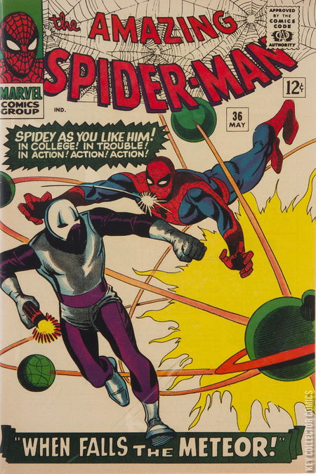 WHEN FALLS THE METEOR! A meteor comes crashing down and Norton Fester, a scientist, retrieves it and looks for funding in order to research microscopic life on it. After being turned down by a bank and his friends, he cracks it open himself. As he does, a trapped pocket of gas emits and he stumbles backward. When he awakens, he discovers new-found strength and lifts a bookcase as if it were a feather. Meanwhile, Peter Parker is back on campus trying to regain a normal social life. As he tries to socialize, he gets worried about being pegged as an “egghead” and afraid to repeat his mistake with Betty, brushes them off. Inside a bank, we see Norton Fester is now the Looter. He robs the bank and blinds those inside with a dazzle gun. As he continues to rob banks over the next few days, Looter finds there’s no more gas in his meteor and decides to find another just in case his power diminishes. Coincidentally, Peter Parker is attending a space exhibit and Gwen Stacy happens to show up as well. Gwen becomes frustrated when Peter only notices the exhibits and is completely oblivious to her presence. Looter shows up to steal the meteor and Spider-Man arrives to prevent it. The Looter uses his dazzle gun to blind everyone and escape. Peter returns to try and talk to Gwen but she writes him off as a coward when he ran and changed. Spider-Man figures Looter will be back and is proven correct when another robbery is attempted. Unsuccessful in his second attempt, Looter tries to fly away with a helium balloon, but Spider-Man springs up a flagpole and catches him. After he knocks him out cold, Spider-Man sails the balloon for the police to arrest Looter before knowing why the meteor was sought after.
