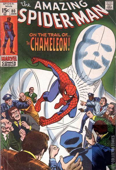 ON THE TRAIL OF THE CHAMELEON! At his apartment mulling over how to deal with what he believes is a relationship going on between Flash Thompson and Gwen Stacy, Harry comes home with Flash. Peter loses his temper and almost pummels his former rival when Flash explains the truth of what happened: That Gwen came to him for advice over her troubled relationship with Peter. Realizing what a fool he's made of himself, Peter calls Gwen to apologize and the two make up and agree to go to the Midtown Museum exhibit where her father is in charge of guarding priceless paintings. Peter rushes there as Spider-Man so he can meet Gwen on time. When Peter and Gwen steal a kiss, Peter's spider-sense goes off but it appears to only be George Stacy, although Peter finds it strange that George walked by as if he didn't recognize it. When the painting that was on display turns out to be stolen, Peter and Gwen realize that George is nowhere to be found. They rush back to the Stacy home where they find a dazed and confused George Stacy with no recollection of making it out to the museum. In reality, the "George Stacy" at the museum is really the Chameleon, who had disguised himself as Stacy to steal the painting, and now gloats over his victory in his secret hide out. That night Peter mulls over who could have possibly framed George Stacy and comes to the conclusion that it could only have been his old foe, the Chameleon. Web-slinging to the Daily Bugle, Spider-Man asks Joe Robertson's help to make a special transfer of a million dollars worth of bonds the front page of the next edition in the hopes that it will flush out the Chameleon. There, Peter is assigned as a photographer under the watch of J. Jonah Jameson. However, Peter slips off to change into Spider-Man and begins looking for the Chameleon. He interrupts the meeting and is disappointed when all the men transferring the money are not the Chameleon. However, Spidey finally spots the Chameleon because he made the mistake of disguising himself as the one person Spider-Man would know has to be a fake: Peter Parker. Spider-Man chases after "Parker" who tries to get away, however, Spider-Man captures the Chameleon, and unmasks him, clearing George Stacy's name. After mocking Jameson at the scene, Spider-Man flees the scene without explaining how he knew that the Chameleon was disguised as Parker.