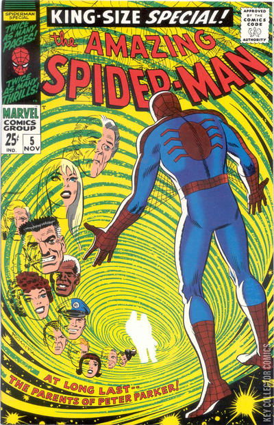 THE PARENTS OF PETER PARKER! When helping Aunt May move stuff around the attic, Peter accidentally breaks open a storage trunk filled with photos and other items belonging to his parents. Among these is a newspaper clipping that identifies that his parents were traitors to their country. Mortified, Peter questions his Aunt May, who tells him of his parents and the last time they saw them alive and how she and his Uncle Ben adopted him when they were killed. Unable to shake this idea from his mind, Peter decides to learn the full story, and so as Spider-Man he seeks the Fantastic Four's aid in helping him travel to the last place his parents were reported seen alive: Algeria. There he learns that his parents were supposedly spies who worked for the Red Skull, and he came across their ID badges for the Skull's organization. Spider-Man also stumbles upon the Red Skull himself, who is in the country to organize a new plot to take over the world. Spider-Man clashes with the Skull and his men and eventually learns from one of them that Richard and Mary Parker were murdered by the Red Skull when they refused to do his bidding. Believing his parents to have died heroes, he goes after the Red Skull once more and defeats him in battle. In the aftermath, he finds that his father's Red Skull ID card has been cracked in the battle, and finds ID cards underneath that identify them as anti-espionage agents, proving to Peter that his parents were secret government operatives. With evidence to clear his parents' names, Peter returns to the United States, happy to know that in reality, his parents died serving their country instead of betraying it. A DAY AT THE DAILY BUGLE A Pin-Up of the Bugle office featuring J. Jonah Jameson, Joe Robertson, Ned Leeds, and Betty Brant. PETER PARKER, THE SUPER SPORTS STAR A two page spread of Peter Parker day dreaming about using his Spider-Powers in a number of different sports. WHERE IT'S AT! A map of Manhattan, showing where the regular places featured in Amazing Spider-Man are located. Places include Peter Parker and Harry Osborn's apartment, The Daily Bugle, Aunt May's house, Empire State University, and the Coffee Bean. THIS IS SPIDEY AS WE KNOW HIM BUT-- Drawings of Spider-Man that are in parody of various Sunday funny strips, including Dick Tracy, Micky Mouse, Superman, Archie and Charlie Brown. THERE WE GO-A-PLOTTING! Stan Lee, Larry Lieber and John Romita are stuck for ideas for an upcoming issue of Amazing Spider-Man. When Larry suffers heartburn due to sourballs, they incorporate this event into a plot where Aunt May also suffers heartburn. They come up with a concept about Aunt May hiring a house maid who turns out to be Dr. Doom in disguise. Stan and John agree on what should happen in the story, to Larry's despair, but right when they're about to put it to paper, Roy Thomas enters the room and tells them his latest Avengers story: About how the Avengers hire a house maid who turns out to be Dr. Doom. With Thomas beating them to the punch, they decide to start all over again with a new story idea - and, to do so, they force Larry to eat more sourballs.