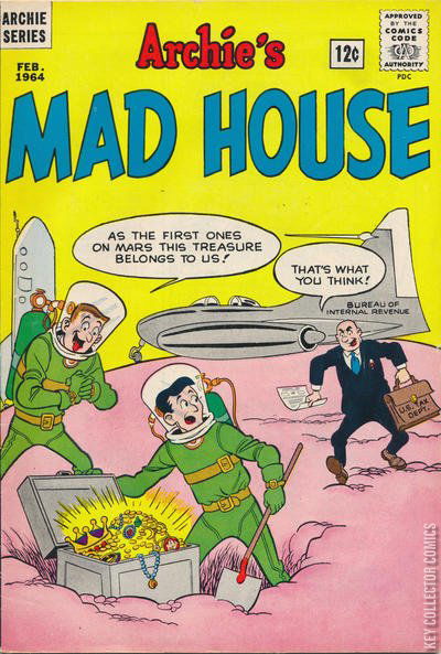 Untitled Alice the Astronaughty Space Girl story, script by George Gladir, art by Joe Edwards; Alice is chosen to be the first girl on the moon, but the launch of her rocket is almost sabotaged by her rival Brunhilda. "What's Wrong with Basketball?"; Mad House solutions for problems with basketball, like too tall teams, officials blowing the whistle too often, etc. "Mad House Guide to Camping and Hunting." "The Sandy Dandy"; Oswald is assigned with driving the Turks out of Arabia; A parody of "Lawrence of Arabia." "Mood TV," pencils by Joe Edwards; Watching TV programs from appropriate settings, like sea programs from the bathtub or psychiatrist programs from the couch. "Teen City," pencils by Joe Edwards; A city designed exclusively with teens in mind.