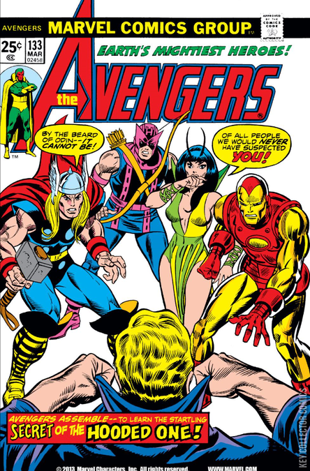 "Yesterday and Beyond..." As the Scarlet Witch continues her magical training with Agatha Harkness, the Avengers are just finishing their adventure in Limbo. There, Immortus has offered to reveal the mysterious pasts of both the Vision and Mantis. Sending the Vision through time on his own to learn his own origins, and the rest of the Avengers with Mantis to learn of her past. While in the present, Moondragon is flying to Earth to answer the Avengers summons for Captain Marvel, and the hooded figure waiting in Vietnam with the spectral Swordsman is revealed to be the Zodiac member Libra. The Vision travels back in time to the year 1939 and learns that he is the original Human Torch, an android invented by scientist Phineas T. Horton, who hoped to build an android to make a fast buck, however, when the android proved to burst into flames when exposed to air, it was locked away. However, the Torch would break free and eventually become a renowned superhero during the 1940s. The Vision learns of the Torch's capture in a pool by the criminal known as Sardo. Meanwhile, the other Avengers are sent back millions of years and view early life on the home planet of the Kree, known as Hala where there were two alien races, the Kree and the plant-like Cotati that lived there. When the Skrulls came to Hala seeking partnership from the dominant race, they put the Kree and the Cotati in a test to see which race was more worthy to share the Skrulls technology. When the Cotati won, the Kree murdered all the Cotati they could find and the Skrull visitors. The Avengers bore witness to the event that started the Kree/Skrull War.