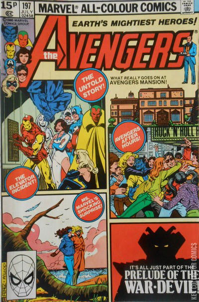"Prelude of the War-Devil!" The Avengers, accompanied by Yellowjacket and Ant-Man, have returned to the mansion following their encounter with the Taskmaster and get stuck in the mansion’s elevator. Iron-Man and Ant-Man quickly remedy the situation and Jarvis is prepared down below with some refreshments after their mission. The Beast offhandedly remarks how Ms. Marvel had left to tend to personal matters and then reminds Wonder Man that he agreed to go on a double date with him, Beast’s latest girlfriend Melissa and her friend Candy. Although McCoy assures him he will have a good time, Simon is apprehensive. On a Long Island beach, the Scarlet Witch is taking a solitary walk when she’s surprised by Ms. Marvel. The latter heroine chides Wanda for thinking of giving up her Avengers' duties for motherhood. Wanda explains that while she still desires to be a mother someday, it is not a priority and she’s made up her mind to rejoin the Avengers. Ms. Marvel is thrilled to hear this, but then suddenly keels over in a faint. Captain America and Iron-Man formally ask an overjoyed Jocasta to become an Avenger. Meanwhile, at Stark Enterprises tech labs, Dr. Earl Cowan and his supervisor inspect the newly restored Red Ronin automation (a giant, pilotable robot built to combat fire-breathing dragons). Cowan was instrumental in restoring the robot to working order. His supervisor remarks that after all the time and effort he put into rebuilding Red Ronin, it will be hard for Cowan to turn the project over to SHIELD. But Cowan bluntly states he has no intention of turning Red Ronin over to anyone and knocks out his supervisor. Just prior to a debriefing meeting (concerning the new information they’ve learned about the Taskmaster’s operations), Iron-Man asks Captain America to officially take over as team leader full-time, to which he agrees. After the meeting, Ant-Man says goodbye to the Pyms, who then enjoy some intimacy during the downtime. Elsewhere, Wonder Man is initially smitten by his blind date, Candy, but decidedly less enthused about her bratty son whom she brought with her on the date. After a blow to the back of his head, Cowan’s supervisor regains consciousness just in time to see Cowan abscond with Red Ronin. In Long Island, Wanda pays a visit to Ms. Marvel who has been admitted to the hospital. Ms. Marvel is devastated to learn she is three months pregnant!