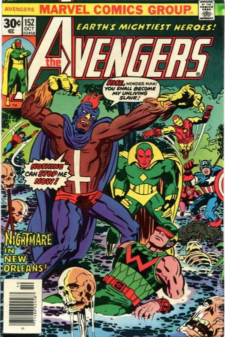 "Nightmare in New Orleans!" During a press conference revealing the latest line-up of the Avengers, the group is shocked when a delivered crate suddenly bursts open revealing Wonder Man, long thought dead. After accusing the Vision of stealing his mind, Wonder Man suddenly passes out. The Avengers rush him inside to examine his body and find out how he managed to cheat death. As Jarvis asks the press to leave for the day, Yellowjacket examines Wonder Man's body and finds that Wonder Man is somehow still alive, despite knowing for a fact that when he last saw him he was assuredly dead. With Wonder Man in a coma muttering the same phrase over and over, the entire group -- especially the Vision, whose brain patterns are fashioned after Wonder Man's, consider the situation. Upset by the whole thing, especially since the group had nothing to do with Wonder Man's current condition, the Scarlet Witch decides to investigate things further. Scaring off a crowd of gawkers from the Avengers Mansion property, she examines the debris of the crate that Wonder Man's body was delivered in. Using her hex powers to examine some dirt clumps she learns that the package had come from New Orleans. Taking Wanda's lead, the Avengers take Wonder Man's body with them aboard a Quinjet and fly to New Orleans. There Wanda uses her hex powers to try and track down the men who were responsible in the resurrection ceremony that rose Wonder Man from the dead as a zombie. Walking around New Orlean's French Quarter, the Scarlet Witch tracks down one of the men responsible and the man gives the Avengers chase. Tripped up by the Wasp and Yellowjacket the man is frightened by Scarlet Witch into revealing the location of Le Morte Bayou (The dead bayou) where the ceremony that resurrected Wonder Man took place. Trying to locate the bayou in question the group is shocked when Wonder Man seemingly stirs to life and answers the call of the "master" who summoned him. Letting Wonder Man go free, the group follows him to see where he goes. They are taken to a voodoo ritual being held by a voodoo priest called Black Talon who also uses his powers to raise an army of zombies from the Earth. As the Avengers battle off zombies and voodoo practitioners alike, Black Talon summons the voodoo god Damballah to increase his magical might. He then gets into a battle with the Scarlet Witch. Although the Black Talon has the upper hand, the Scarlet Witch's mutant nature saves the day as she fights off Damballah and knocks out Black Talon by pitching a number of logs at him. With Black Talon's defeat, his minions flee into the bayou in fear. With the battle over the group learns that Wonder Man wasn't resurrected by Black Talon at all but brought to him already in a state of living. They decide to return back to New York, except the Scarlet Witch, whose battle against Black Talon and the turmoil caused by Wonder Man's return from the grave has led her to leave the group to go and explore the mystical nature of her mutant powers.