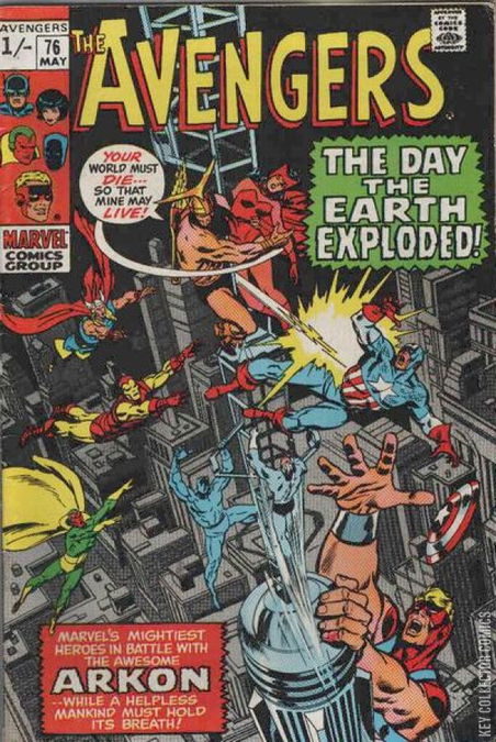 "The Blaze of Battle... The Flames of Love!" Continuing from last issue... The Avengers have built a device called the D-Machine, which they hope will allow them to bridge the gap between their world and Arkon's. However, the first test proves unsuccessful and the machine explodes, leaving the Avengers to start over from scratch, much to Quicksilver's irritation. Meanwhile, Goliath is visited by the Black Widow who has returned from yet another mission. She explains to Goliath that she can never see him again. While on Arkon's world, the Scarlet Witch tries to convince Arkon not to destroy her world, a request that Arkon refuses to grant. He takes her into his castle's prison where he is holding Toad, and the nuclear physicists he kidnapped as hostages. There he is using a device to siphon the physicists knowledge of nuclear power in order to build a device -- the atomic sphere -- to destroy the Earth, which they believe will restore the light to Arkon's world. The Avengers arrive (with the added power of Iron Man and Thor) on Arkon's world and storm his palace and a great battle erupts. However, the Avengers are overwhelmed and they are unable to prevent Arkon from transporting himself and the Scarlet Witch back to Earth. They appear on the Empire State Building where Arkon is about to use the atomic sphere to destroy the Earth, however, a number of Avengers arrive to stop him. During the battle, Arkon is stopped when he is contacted by his adviser, who explains to him that Iron Man and Thor (who were among the Avengers who stayed on Arkon's world) created a device that utilized Thor's thunder powers to restore the light to his world. With his world back to normal, Arkon has no desire to destroy the Earth, so he stops his rampage and bids farewell to the Avengers. Before leaving, he tells the Scarlet Witch that he will not force her to marry him and that their travels between worlds have restored her mutant abilities before he returns to his home world.
