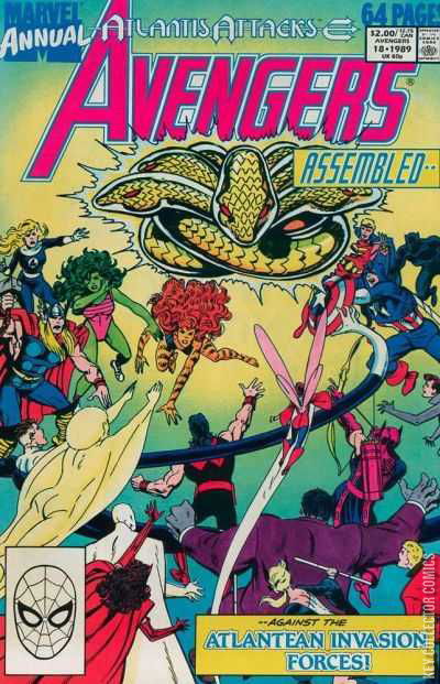 ATLANTIS ATTACKS PART 8 - AVENGERS ASSEMBLED Ghaur and Llyra, having reconstructed the Serpent Crown, order an Atlantean attack on the surface world, the next step in their plan to bring the Serpent God Set to Earth. The Atlanteans lay siege to their chosen targets, but are met by forces comprising all available Avengers. The heroes defeat the water-dwellers, while Warlord Krang falls to a mysterious armored assailant. THE INITIATION OF QUASAR AVENGERABILITY ANALYSIS Captain America profiles several Avengers, discussing their strengths and weaknesses. SAGA OF THE SERPENT CROWN - MANIFEST DESTINY Details the time that Destiny (Paul Destine) spent with the Serpent Crown. As told by Uatu.
