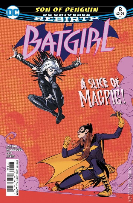SON OF PENGUIN, PART 2 Barbara is going on a date with Ethan Cobblepot, Penguin's son. After dealing with a Two-Face's scheme, she presses Ethan to talk about his connection to the Penguin: Ethan's mother was a waitress at the Iceberg Lounge whom the Penguin knocked up. Cobblepot wanted nothing to do with the child, but out of a sense of duty more than anything, he was never late with child support. When Ethan got into Yale, Oswald sent a check for his tuition and announced that his obligation was done. Since Ehan did not need the money he came to Gotham to return the check in person. The Penguin said Ethan could do whatever he wanted with the check and wanted him out of his office. Ehan used that money to start his VicForm firm. The next Saturday Barbara goes to South Burnside elementary school where she does volunteer work teaching kids Computer Science. After school a kid is picked up by her "walkhome". That night Barbara is spying on Ethan before going out with her friends. When a girl is having trouble with a stalker, Barbara offers to walk with her back home. The girl declines and pulls her cell phone out to get a "walkhome". Apparently, "Walkhome" is another app built by VicForm. Barbara gets a bad feeling, so she changes clothes and goes outside to watch over that girl. Her walkhome turns out to be Magpie, who deals with a stalker brutally. Batgirl engages Magpie, who complains that she is trying to earn a living because she has to pay rent... and then whips out a handgun. Batgirl disarms and punches Magpie out. Barbara is more determined than ever to keep an eye on Ethan. And Ethan is determined to carry through with his plans, getting Batgirl out of the way first.