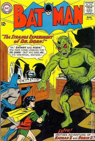 DANGER STRIKES FOUR Dick Grayson reads Alfred's latest Batman II and Robin II story, in which the future Dynamic Duo battle a renegade scientist and his robot. The story gives Robin an idea of how to deal with a real-life threat to Gotham City. After Robin's idea saves the day, Batman and Robin return home and Robin provides the best ending to Alfred's story, based on his own experience. THE AMAZING ODYSSEY OF BATMAN AND ROBIN Batman and Robin are swept away in the Bat-Boat by a tidal wave caused by an underwater volcano eruption and are eventually captured on an island controlled by a criminal magician. Batman and Robin have to overcome capture by the island's natives, who have been enslaved by Kardo. Eventually Batman and Robin subdue Kardo and the natives realize Kardo's power was an illusion. Before they and capture Kardo, he releases am amnesic vapor and escaped via secret seaplane. After leaving the island bound for Gotham they are attacked by a giant squid and apparently killed. When the news of their deaths becomes known to the public, the criminal magician decides to capitalize on the heroes' absence, but he soon realizes that he has been tricked into going into action while the Dynamic Duo were waiting to capture him. It is later revealed that the heroes faked their deaths in order to capture the crook. THE STRANGE EXPERIMENT OF DOCTOR DORN Batman and Robin battle a huge, green humanoid monster that claims to be the creation of a Dr. Dorn. Seeking out Dr. Dorn's help, he offers to create an antidote capable of destroying the creature. But, after some investigation Batman realizes that the creature is actually Dr. Dorn transformed after inhaling the vapors of a strange chemical concoction. Without wanting to harmi the scientist, Batman uses the antidote created by Dorn during one of Dorn's terrible transformations, and Dorn returns to his normal state never realizing that he was the creature all along.