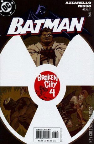 BROKEN CITY PART 4 Batman chases down a street thug and knocks him down. He is attacked from behind by a female member wearing the same gang colors. As Batman stands up he sees a large man carrying a fish hook. He learns the woman is Little Boy and the man is Fat Man. Batman tells them he is looking for Angel Lupo, just as they are. Fat Man tells Batman that Angel is not a killer and that someone else must have killed his sister. Batman moves throughout Gotham rousting the criminal element and interrogating all that he finds as to where he can find Lupo. Batman learns that Angel's sister was pregnant when she died. He meets with Killer Croc and the two get into a fight. In the midst of the fight, a woman shows up and shoots at Batman and Killer Croc. As Batman realizes he must now find Angel to save him, instead of to bring him to justice, he detains his attacker.