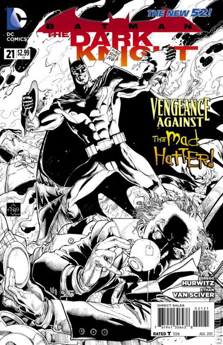 MAD Looking on at the scene atop GCPD Headquarters, Batman ignores Alfred Pennyworth's attempts to contact him while he attempts to swallow his grief at the death of Natalya Trusevich, whom he had loved. The Mad Hatter had dropped her from a helicopter, and her body had crashed into the lens of the Bat-Signal, killing her on impact. For a moment, Bruce nearly cries, but instead, steels himself through anger, and demands of Alfred the most likely location of the Hatter's hideout. As Batman speeds away, Alfred discovers what happened via satellite images, and hails his master with worries that Bruce is in no state of mind to face the Hatter - not after losing another loved one. Coldly, Batman snaps that if Alfred tries to stop him, he will run him down. Sighing, Alfred wishes Bruce luck. Gritting his teeth, Batman leaps down into the Hatter's underground lair, unsurprising to find that the madman has created a kind of Wonderland for himself. Soon, he is attacked by a horde of Gothamites who have fallen under the Hatter's control thanks to the hats he sold them. They overwhelm him quickly, but spots a railing above on which to grapple, and pulls himself out of their reach. Up there, he encounters Tweedledum, who begs to be left alone. Instead, Batman subdues him and deactivates the mind-controlling device he controlled. Elsewhere, the Hatter prepares for his inevitable encounter with the Batman by drinking psycho tea, filled with psychotic drugs. Soon, Batman catches up to him, and at the moment of their coming face to face, the Hatter blows a hallucinogenic dust into his enemy's face. Almost immediately, Batman begins to lose grip on reality, tormented by Carrollian nightmares. He recoils when a mangled and disfigured Natalya begs to know why he didn't get to her in time - why he gave up his chance at true happiness by letting her die. In his attempt to escape her, he finds himself instead at the Monarch Theater, watching himself being taken by his mother and father to see the Mark of Zorro, only to have them transform into his hated rogues gallery. Struggling to regain control over his situation, Bruce seeks to focus all of his horror and confusion into something he is more comfortable with: rage. At the first opportunity, Batman fights back against the next nightmare, unwittingly unhinging Tweedledee's jaw. The Hatter challenges Batman to take him on, unprepared for Batman's rage. After taking just one hit, the Hatter begins screaming for help, but receives none. Bleeding, he attempts to crawl away, only to find himself cornered again by the angry Dark Knight. Watching from the Batcave, Alfred cringes as Batman's fists pummel Jervis Tetch with attacks that will surely kill him. Even as the Hatter sobs and coughs for Batman to stop, Bruce punches him into a pool of water, knowing that if he does nothing, the unconscious Tetch will drown. Desperately, Alfred pleads with Bruce to turn around and pull him out of the water; to save him. Bruce keeps walking, and Alfred is forced to remind him that if he lets Jervis Tetch die, he will be just like those he fought to stop. Hesitating, Bruce's resolve crumbles, and he turns around to retrieve the Hatter's limp body from the water. That night, Bruce returns home covered in blood, and assures Alfred that none of it is his. Ignoring the morbid joke, Alfred expresses relief that he didn't lose Bruce to rage, but Bruce responds that he isn't sure that he wasn't lost, after all. One month later, Commissioner Gordon tapes the Bat-Signal back together in order to call for help with a heist at the depository. In the Batcave, Alfred suggests that Bruce consider going through with his plan to give up being the Batman for Natalya, even though she is gone now. Though Gordon's officers believe that Batman won't answer the call, Gordon is convinced that he must. To Alfred's disappointment, Gordon is right.
