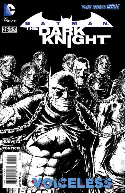 VOICELESS PART 1 Across the US-Mexican border, a woman struggles to keep up her job in an assembly factory, accidentally breaking one of the Christmas ornaments she'd been making. One too many mistakes, the foreman throws her out. She returns home, where her mother and two children are not faring well. Hoping to buy medicine for her baby, she arrives too late to the pharmacy, and receives no help from the owner. Before long, her baby is dead. At his funeral, a relative suggests she move to Gotham City, but she rejects the advice. Soon, her daughter becomes ill as well. Realizing she has little choice, if she wants to see her daughter survive, she decides to go to Gotham, via an illegal human-smuggling ring. En route, the men bringing them across the border sell them to slavers, who separate the woman from her mother and child. Eventually, sick girl and her grandmother are working in a sweatshop with a view of Gotham Square, ironically making Christmas ornaments on an assembly line. Hearing her granddaughter's coughing one night, the older woman seeks to escape and get help, but is caught, receiving a stab wound before falling from a high window into an alley. Somehow, though, she manages to drag herself away. Angrily, The Penguin punishes his men for allowing her to escape. Meanwhile, the stumbling and wounded grandmother collapses in the street, and is found by the Batman. Crumpled in her hand, he discovers a flyer for the workshop where her family is being kept, and becomes enraged that this could be going on in his city. The girl wakes in her bed to the sound of an alarm, and prays for an angel to save her. The Batman comes instead, smashing through a window, and upon realizing how poor her health is, takes her directly to the hospital. Back at the sweatshop, he makes an attack against the slavers, freeing the children. Though they escape, he ends up caught in the slavers' nets, and captured. When the Penguin learns what his men have caught for him, he is elated.