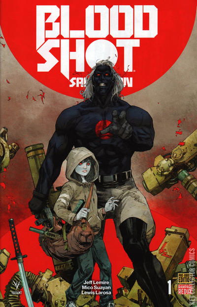 A BLOCKBUSTER NEW ONGOING SERIES! From New York Times best-selling writer Jeff Lemire (BLOODSHOT REBORN, Moon Knight) and extraordinary artists Lewis LaRosa (BLOODSHOT REBORN) & Mico Suayan (BLOODSHOT REBORN), a bloody and vengeful new era for Bloodshot begins this September as Ray Garrison escapes his violent past to build the one thing he never thought he’d earn: a family. But when a hateful secret from his true love’s past threatens their fragile peace, Bloodshot will be forced to run headlong into a barrage of blood, bullets, and broken bones for a revenge-fueled assault that will have crushing consequences for those he holds most dear… His sacrifice will be her salvation. Now: In the arms of his beloved girlfriend Magic, Bloodshot has finally found hope for the future…in the form of the couple’s unborn child. But when Magic’s estranged family – a cruel and sadistic clan of homegrown criminals – re-emerge to lay claim to their lost daughter, Bloodshot will be pushed back to the brink of madness, mayhem, and warfare… Soon: Eight years from today, Bloodshot’s daughter has inherited her father’s incredible abilities. Hunted by a high-tech kill squad called Omen, Jessie must hone her powers…and learn how to survive before the world is swallowed whole by the darkness that now pervades America…