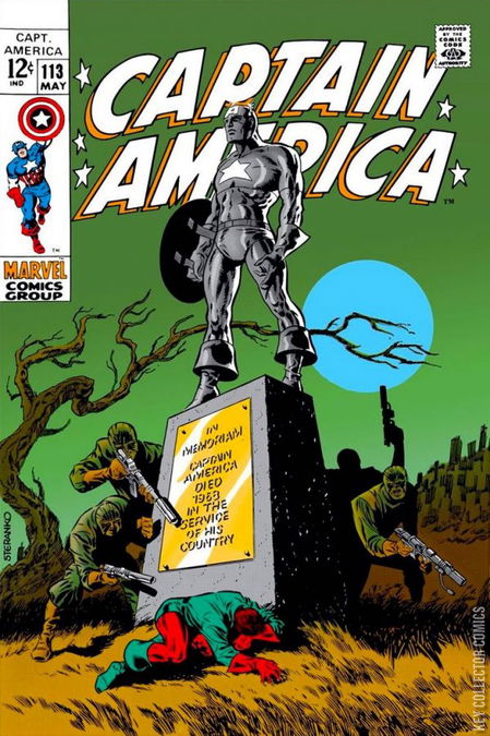 The news breaks that Captain America has been shot but still no body has turned up...just a bullet riddlrd costume, along with a very life-like Steve Rogers mask!! At a secret Hydra base, Madame Hydra and her hoards are celebrating their victory! Madame Hydra thinks back to her own origin, and we see it unfold before us in a full page montage. The Avengers are gathered, and await Rick Jones, so he can tell them about those events leading up to Cap's demise. But Rick is still quite shaken, and cannot talk about this yet. He tells the gathered Avengers to call Nick Fury, and then leaves to go and think. Next, the Avengers and Fury are gathered for a funeral service to Cap. His costume has been placed on a wax figure, and lies in the open coffin. Suddenly, Fury notices a card in the coffin....a card with Hydra's logo on it! As soon as Fury touches it, the room is filled with sleep gas, and the Avengers are all placed in seperate coffins by Hydra agents! Rick arrives to find these coffins being loaded into a caravan of cars. He hops on the back of one as they leave,and make their way to a cemetery far out of town. It is here that Rick realizes that those "bins" contain the Avengers!! As he is crouched behind a tombstone,watching, a Hydra agent gets the jump on him, but as this happens.........the scene is shattered by the roar of a motorcycle as Captain America leaps from this and takes out the Hydra agent! CAP IS ALIVE!!!!!! Amassive fight ensues in the graveyard as the hoards of Hydra one by one get trounced!!Madame Hydra tries to escape, but after she has fired heat seeking mini missles at Cap and Rick, she is blown up by the very missles, due to our heroes ducking into a grave pit to avoid them! Cap reveals to Rick that his faked death, and that of Steve Rogers was all part of his plan to convince the world that Cap was NOT Steve Rogers! Now nobody will know who is behind the mask, as Captain America has a secret identity once again!!!
