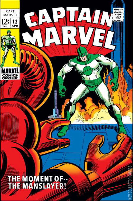 The Moment of the ManslayerThe issue begins with Mar-Vell receiving an insurmountable amount of new powers from the being named ZO. In exchange for his new abilities, Mar-Vell has agreed to serve ZO once he has gained his revenge on Yon-Rogg. Mar-Vell streaks through space to track down the starship Helion on which Yon-Rogg is based. However he first takes a detour to the asteroid where he had buried his love Una. After paying his respects, the Man of Kree plans on how best to make Yon-Rogg suffer for his crimes, rather than giving him a swift death. At the same time, Yon-Rogg wakes up screaming as he feels Captain Mar-Vell staring at him, but the Colonel convinces himself that his foe is surely dead and he was merely having a nightmare.Mar-Vell uses his new teleportation ability to head back to his hotel room in Florida, however miscalculates the location and ends up in a Communist Latin American country. Before he is captured by soldiers, Mar-Vell once again teleports and this time reaches the hotel. A newspaper inside his room shows Mar-Vell his Earth identity, Dr. Walter Lawson, has been reported AWOL from duty at The Cape military base. Meantime General Bridges informs The Cape’s Head of Security, Carol Danvers, that Captain Marvel is to be shot on site and gives her permission to arrest Dr. Lawson. Elsewhere in a Caribbean military base, Black Widow is on a mission on orders from Nick Fury. Within the base a figure sits in a control room watching as his android creation, The Manslayer, approaches The Cape.Walter Lawson arrives at The Cape and is immediately arrested when suddenly The Manslyer strikes. Whilst the soldiers are distracted, Lawson creates the illusion of a protest group and disappears in the confusion to change into Captain Marvel. Meantime Black Widow attempts to capture the man at the controls but is captured herself by more Manslayers. The android at The Cape is ordered to destroy a new rocket when Captain Marvel strikes. A battle ensues and...