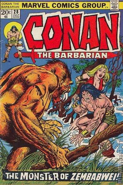 Moon of Zembabwei, script by Roy Thomas, pencils by John Buscema, inks by Ernie Chan [as Ernie Chua]; setting: rain forest; M'gorah dies; Thutmekri wounded (unknown if he dies or not); Conan saves Helgi by killing Zemba (an Ape-God); adapted from the non-Conan story, "Moon of Zembabwei by Robert E. Howard. Cover pencils by Gil Kane, inks by Ernie Chan [as Ernie Chua].
