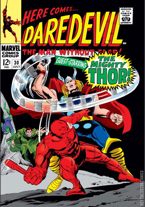 IF THERE SHOULD BE A THUNDER GOD! When the Cobra and Mr. Hyde begin a crime spree, Matt decides to try and flush the crooks out by disguising himself as their old foe, the thunder-god Thor. However, he attracts the wrong attention when Thor learns about the ruse and attacks Daredevil for daring to pose as him. After a brief battle (which attracts the attention of the two villains in question) Thor leaves to attend to more important business, warning Daredevil never to pose as him again. Soon after, Daredevil is attacked by Mr. Hyde and the Cobra. During the fight, Mr. Hyde douses Daredevil's eyes with a chemical that would make a normal person blind, it effects Daredevil in a similar way; eliminating his enhanced senses.