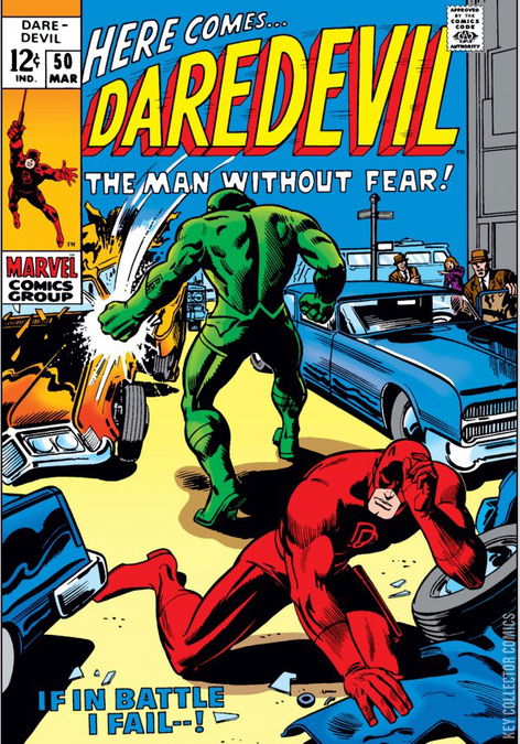 IF IN BATTLE I FAIL! While Daredevil continues to battle the robot created by Starr Saxon and sent to destroy him by Biggie Benson, Karen Page tries to call Matt Murdock but to no avail. As the battle rages from Murdock's apartment to the city street, Foggy begins to realize how working for the first time without Matt Murdock is a lonely experience. DD manages to knock the robot hard enough to disable its programming making it return to Saxon for more instructions, allowing Daredevil to follow it to its master's lair. Revealing himself to Saxon, the two get into a fight until the robot is accidentally programmed to kill Biggie Benson. Daredevil tries to stop the robot, but continues to be overpowered, rushing to the prison where Benson is being held prisoner, DD exhausted fighting his way into Benson's cell, passes out just as the robot busts through the wall.