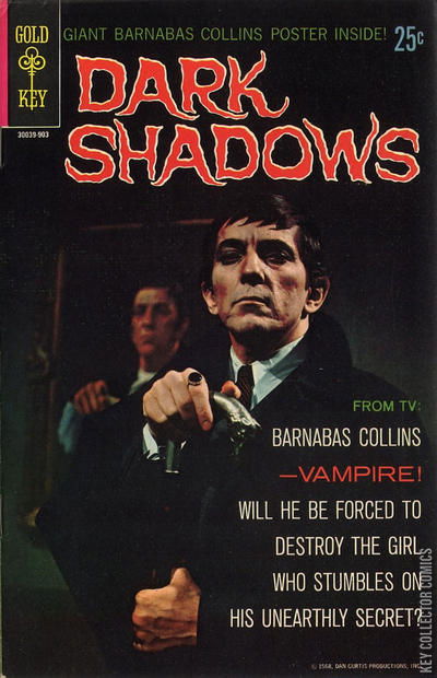 From TV: Barnabas Collins -- vampire! Will he be forced to destroy the girl who stumbles on his unearthly secret? Find out in "The Vampire's Prey"! Characters: Barnabas Collins (first appearance; origin); Angelique Bouchard (first appearance; villain; a ghost). Written by Don Arneson, with art by Joe Certa. Photo cover.