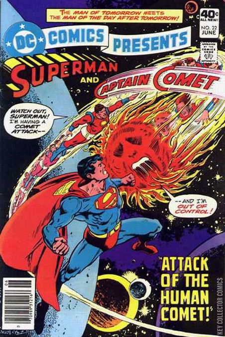 Plight of the Human Comet Captain Comet's powers are fading away and he seeks Superman for help but the man called Starstriker has other ideas in "Plight of the Human Comet." Script by Mike W. Barr and art by Dick Dillin & Frank McLaughlin. This tale includes a cameo appearance by Wonder Woman.