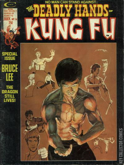Stan Lee Presents: The Deadly Hands of Kung Fu. Special Bruce Lee issue. Cover by Neal Adams. Includes: "Enter the Letters!" A letters page with readers' thoughts on previous issues. Shang Chi, the Master of Kung Fu, stars in "Thief in Golden Shadows!" Story by Doug Moench. Art by Rudy Nebres. "Bruce Lee Again-For Better or Worse!" An article about the legendary martial artist by Wan Chang O'Shaungnessy. "The Art and Non-Science of Jeet Kune Do!" An article by James Glenn on the martial arts technique developed by Bruce Lee. "The Way of the Weapon!" An article on Bruce Lee's mastery of weapons in martial arts by Thomas Sciacca. Plus, the Sons of the Tiger star in "The Valley of the Ancestors!" Story by Bill Mantlo. Art by George Perez and San Adkins. Includes a B&W poster of Bruce Lee. Black and white.