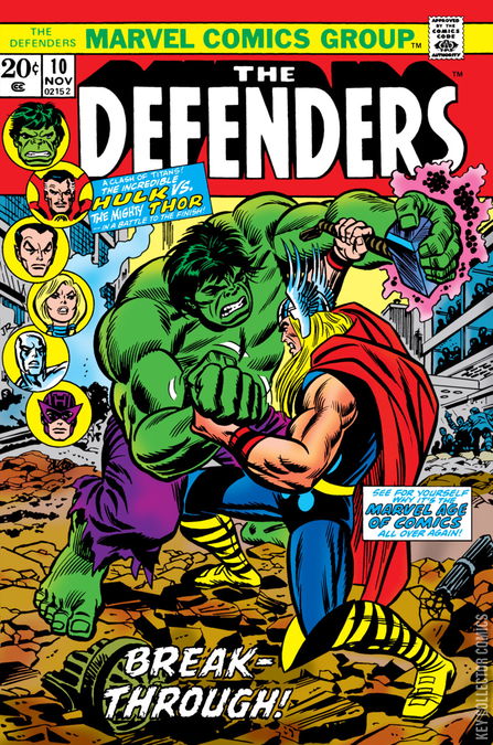 "The Avengers Vs. The Defenders Chapter 9: Breakthrough! The Incredible Hulk Vs. The Mighty Thor" - Continuing from Avengers #117... The Hulk and Thor have arrived in Los Angeles, California both searching for the final fragment of the Evil Eye. When Hulk finds the Eye, Thor tries to convince him to surrender the item since he is the weaker of them. Of course, this only enrages the Hulk, because he believes no one is stronger than the Hulk! And... "Chapter 10: United We Stand!" - Moments before the Hulk and Thor's battle, the remaining Defenders await the return of Namor, who arrives with all the Avengers. Before a fight can break out, Namor explains how a truce was made when he battled Captain America in Japan. Realizing the only two unaccounted for were Hulk and Thor, the combined hero groups head off to LA to stop the two powerhouses before they can cause more damage.