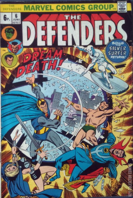 "The Dreams of Death!" - As the Silver Surfer is traveling to Dr. Strange's Sanctum in order to apologize for the way he had acted in his last encounter with the Defenders, he finds a strange mystic cube formed around the Sanctum. Able to pierce through it he finds that the Defenders are under attack by Cyrus Black (a mystic bent on proving he is superior to Dr. Strange) and his followers.