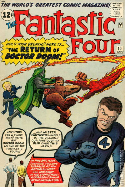 THE RETURN OF DOCTOR DOOM Reed Richards is conducting an experiment on how to photograph Sue while she is invisible when suddenly the team notices the Fantastic Four signal flare in the sky. Trying to rush to the signal, Reed finds the locking mechanism on his lab door jammed and uses his stretching powers to try and reach the release on the other side but his arm goes the wrong way, forcing Johnny to use his flame powers to melt through the lock. The group rushes through avid fans to the apartment of Alicia Masters, Ben's girlfriend, where Ben reveals that he just wanted to show his teammates the various sculptures that Alicia has made of the Fantastic Four's various foes.  Meanwhile, at the offices of Marvel Comics, writer Stan Lee and artist Jack Kirby, who have been licensed to create Fantastic Four comic books based on the heroes' adventures, are stumped over creating a new villain for the group to fight as all their other previous foes have been vanquished.  As Jack is trying to pitch a new villain named False-Face they are interrupted by Dr. Doom who demands that they call Reed Richards to their office to lure him in a trap, threatening to show them his horribly scarred face if they do not comply.  Reed is called over, but when he arrives he is gassed by Dr. Doom who then teleports away with Richards as his prisoner. When Reed awakens at Doom's laboratory, Reed is shocked to see his old foe who was last seen being carried away on a meteor. Doom explains that he survived when he was rescued by an alien race called the Ovoids. Learning that these creatures had great mental powers, Doom forced them to teach him their method of transferring minds into other bodies before they returned him to Earth. Doom then demonstrates this ability by swapping bodies with Reed. The two fight it out, but Dr. Doom has the advantage by using Reed's own stretching powers against him.  Soon the rest of the team, tipped off by Stan and Jack, arrive at Doom's lab and easily subdue "Dr. Doom", Reed's attempts to convince his team that Doom has swapped bodies with him fall on deaf ears. Doom (pretending to be Reed) then convinces the team that the only way to be rid of Doom is to trap him forever. While the other members of the team suggest ideas to do that, "Reed" has a better idea and shows them a trap that he devised in the basement of the lab. With "Dr. Doom" trapped in an unbreakable glass cage, the rest of the team leaves, leaving Reed and Doom alone. Doom gloats over his victory, pointing out that the air cylinders in the unbreakable glass cage will run out of air in exactly an hour and then leaves Reed to his fate.  While pretending to be his greatest enemy, Dr. Doom then begins working on a shrinking ray and starts testing it on animals that his teammates realize have gone missing from one of the local zoos when the animals might break free.  When Sue and the others start to question "Reed's" work, Doom tells them that he has come up with a theory that the dinosaurs went extinct due to their large bodies and small brains. He then suggests that through a process of shrinking someone in size and then restoring them to normal could boost not only their mental power but their physical abilities. Doom then sells the team on the fact that with this method the Torch would be able to fly in space, Sue would be able to turn selected parts of her body invisible, and Ben would be able to revert back and forth from human form. The group is ecstatic and Doom tells them that he will use it on them once the tests are completed. However, Doom really intends to shrink the group down to nothingness, eliminating his hated enemies forever.   Meanwhile back in the unbreakable glass cage, Reed tries to break through a flaw in the glass using Doom's mask and succeeds in punching holes in it. He then takes one of the air cylinders and plugs the hole with it, then tosses another at the first cylinder. The resulting explosion breaks the glass, freeing Reed from his death trap. He then goes to Alicia's apartment and tries to convince her that he is really Reed Richards trapped in Dr. Doom's body.  However, Reed is unaware that Sue was there to tell Alicia the "good news" and she manages to knock Reed out by smashing a vase over his head. When Ben and Johnny arrive, they try to attack "Dr. Doom" but Reed manages to instill doubt in their minds, convincing them to bring him back to the Baxter Building with them. However, they bring "Doom" to "Reed" who binds Reed up so he can conduct his shrinking experiment on the other members of the Fantastic Four. When Doom decides to start on Sue first, Reed tries to protest, raising more doubt in the mind of Johnny and Ben.   Johnny decides to test his suspicions by using his flame powers to create a mirage of a stick of dynamite. When the mirage appears, "Dr. Doom" tries to shield his teammates from the blast with his own body while "Reed" tries to flee the scene. Realizing that "Dr. Doom" was telling the truth, Ben grabs "Reed" and pulls him back into the room. With the ruse revealed the process reverses itself.  With Doom back in his original body, he begins to attack the Fantastic Four. During the scuffle, Reed is knocked back into the controls of Doom's device. In a bit of irony, Doom's shrink ray blasts himself causing him to shrink to seeming nothingness, leaving the Fantastic Four to wonder if their foe has been vanquished forever.