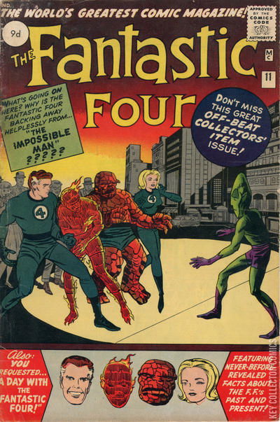 A VISIT WITH THE FANTASTIC FOUR After visiting with some local fans of theirs, the Fantastic Four get another mail delivery from their mailman Willie Lumpkin. Reading their fan mail, the FF responds to readers' letters: After trying another serum to change him back to human form, Ben and Reed tell the story about how they met in college and eventually fought in World War II. They then retell the origin of the Fantastic Four. When Sue gets upset by reader mail that expresses people's dislike of her and questions her usefulness on the team, the FF angrily defend Sue by telling of the times that Sue helped the team defeat the Skrulls, and when she saved the team from Dr. Doom's death traps. To cheer Sue up they take her aboard the flying saucer they have had since their adventure on Planet X, where Sue finds a surprise birthday cake waiting for her. As they celebrate Sue's birthday, Willie is slogging back to the Baxter Building with another bag full of fan mail for the FF. THE IMPOSSIBLE MAN! An alien being from the planet Poppup arrives on Earth and appears before a group of hobos seeking entertainment. When he asks the homeless men for food they tell the alien that the only way he can get food is with money. Taking this as literally as possible, the alien goes to a nearby bank and takes bags full of money, using his shapeshifting powers to get past a teller. When he is stopped by police they begin to shoot at the alien, who quickly turns into metal to deflect the bullets, sending the police fleeing. The authorities then call in the Fantastic Four to handle this alien being and they find the extra-terrestrial gorging on food at a fancy restaurant. Asking where he came from, the Fantastic Four learn that this alien came from the planet Poppup where his people evolved into beings that could change shape into any form in order to deal with any threats to their lives. When they tell the alien that he cannot just steal money, he points out that nobody tried to stop him. The Thing and Human Torch to try to subdue the cocky alien, but his shape-changing powers defend him well from any attack. Learning that this alien is on vacation, Sue tries to reason with him explaining that he can't just break Earth laws. When she asks the alien what his name is, he explains that Popuppians do not have names because they "know who they are." When he tries to walk out of the restaurant another fight breaks out and the Thing coins this alien as "impossible," prompting everyone to begin referring to him as the Impossible Man. The Fantastic Four chase the creature outside where they battle him some more. When the army sends in soldiers, Reed tells them to stay back, prompting the Impossible Man to change into a bomb. Reed quickly uses his stretching power to toss the "bomb" into the air where it explodes harmlessly. Flying around on wings, the Impossible Man is then brought down when the Human Torch uses his powers to create a hypnotic pinwheel out of flame. Eventually, Reed deduces that the Impossible Man is encouraged by people's reaction to his antics and that he is starved for attention. He then sends out a message to everyone in New York to simply ignore the Impossible Man. Miraculously the people of the city do just that and begin to ignore the impish alien's destructive games until the Impossible Man grows so bored with the lack of attention he decides to leave Earth, vowing that neither he nor anyone else from his race will visit the Earth ever again, much to the relief of the Fantastic Four.