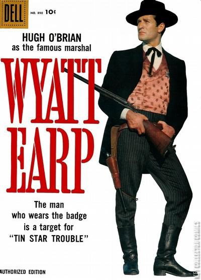 ndicia title is "WYATT EARP, No. 890." Based on the "Wyatt Earp" TV series. Photo cover of Wyatt Earp (as played by Hugh O'Brian). The Twelve-Inch Law fact page; How Wyatt Earp received his special gun from writer Ned Buntline. Tin Star Trouble; Deputy Marshal Jeff Moore, who is looking to make a name for himself, is sent to Dodge City for some training under Wyatt Earp. The Last of the Buffalo Hunters; Three former buffalo hunters are trying to start a freight line in Dodge, but a competitor tries to frame them as arsonists and vandals in order to force them out of business. Fire! fact page; How fires were fought in the Old West.