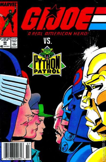 In a wickedly funny parody of both toy marketing and the trade of weapons of war,a GI Joe Advisory Team under the command of Hawk helps upgrade the defense of European democracy 'Volkekuckuckland' with surplus GI Joe equipment while Cobra and Destro's cousin Darklon attempt to unload,err,that is 'deliver the goods' to the same small nation by upgrading cheap Cobra weaponry with Dr. Mindbender's new 'Pythonizing Process' to render soldiers and equipment radar and infra-red invisible. Perhaps the most amusing single issue of GI Joe,#88 also introduces the still popular 'Python Patrol' toys to the storyline.
