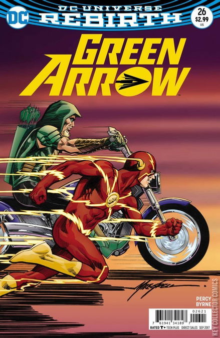 HARD-TRAVELING HERO, PART 1: SPEED MOUNTAIN Unwilling to let another city suffer the same fate as Seattle, Green Arrow kicks off a new quest to hunt down the Ninth Circle across America! To stop disaster before it can happen, the (in)famously hot-headed Oliver Queen must mend fences with those he’s alienated in the past, starting with THE FLASH! The second epic year of GREEN ARROW REBIRTH begins here!