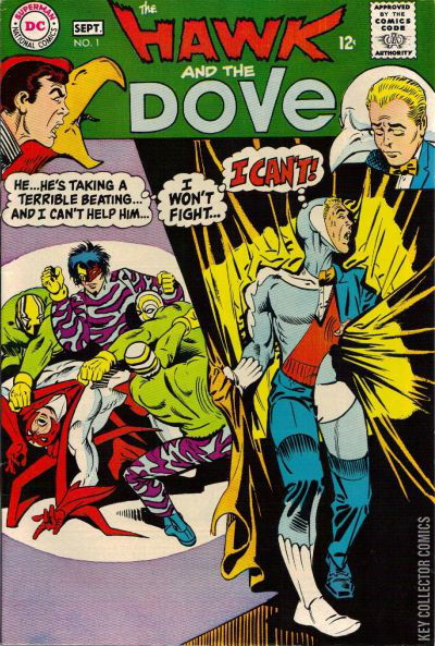 Title: "The Dove Is A Very Gentile Bird" When a party attended by Judge Irwin Hall and his two sons is interrupted by a gang of crooks called the Drop-Outs, Hank Hall becomes the Hawk and tries to stop the robbery. The crooks get away, and Judge Hall declares the Hawk a menace. Hawk escapes before the police arrive and accuses Don of cowardice for not taking action. Hawk continues to hunt for the crooks, but they strike at an art show which Don is attending. Don refuses to resort to violence to stop the crooks, so he decides to take action another way. He remembers that Rita Watkins, one of the party guests, acted like she knew one of the crooks. Don tracks her down and learns where the crooks are hiding. Hawk has already found the crooks' hide-out and is there when Don arrives. Don finally becomes the Dove to help his brother, but he refuses to hit the crooks. Instead he tires them out by dodging their attacks, then entangles them with rope. Hawk and Dove leave the crooks for police and continue their argument of violence vs. non-violence all the way home.