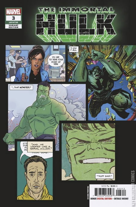 POINT OF VIEW What happened in the church on Mercer Avenue? What made the Lembert boy do what he did? Who is the One Below All? Reporter Jackie McGee has four eyewitnesses, with four different viewpoints, telling four different stories. But they all saw Bruce Banner…and the Immortal Hulk. LEGACY #720 Leonardo Romero's segment is based on the classic superhero style. Paul Hornschemeier's segment is meant to be reminiscent of an indie style typical of the art-comix from the 1990s. This issue's format was inspired in part by an episode of the Italian strip Il Commissario Spada in which involved the titular policeman chasing a purse-snatcher and asking various witnesses about him, with each witness describing him differently, accompanied by a visual sketch of what they're talking about, while the actual perp looks totally different. Per Al Ewing's note to his editors (reprinted in Immortal Hulk Director's Cut #3), the story is told in five distinctive styles: regular, super hero, indie, romance old-school horror. This issue's cover is an homage to Curtis magazine Hulk! #13. 1st mention of the One Below All Circulation: 44,389