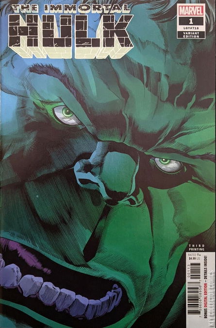 OR IS HE BOTH Horror has a name. You'd never notice the man. He doesn't like to be noticed. He's quiet. Calm. Never complains. If someone were to walk up and shoot him in the head...all he'd do is die. Until night falls. And someone else gets up again. The man's name is Banner. The horror is the Immortal Hulk. LEGACY #718 A behind the scenes video was released by Marvel on YouTube to promote the series. This issue's cover is an homage to that of Incredible Hulk #105. Premiere issue of the new series that explores the Hulk's immortality 1st appearance of Jackie McGee, inspired by Jack McGee from The Hulk TV series Circulation: 84,153 Continuity Notes Bruce Banner was killed by Hawkeye in Civil War II #3 using a specialized trick arrow. Banner returned to life in Avengers #679-682. As shown in Avengers #684, the Hulk is in fact immortal, although Banner isn't. Continuity Errors Detective Mayes states the police collected shell casings from the scene of robbery but Hill is depicted using a revolver, which don't eject spent casings.