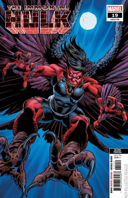 BUTTERFLY Something is coming for Bruce Banner. Something that can smell him wherever he hides. Something that will never stop hunting. It wears the face of a friend—but all it feels is hate and hunger, burning in the core of every cell. Ask yourself...what’s more terrifying than the IMMORTAL HULK? LEGACY #736 This issue includes flashbacks to Betty's interactions with Bruce and a timeline of their relationship. The issues referenced include Incredible Hulk #1, Incredible Hulk #167, and Incredible Hulk #331. The final panel, where Betty is shown eating the Hulk's heart, is reminiscent of the painting Saturn Devouring His Son by Francisco Goya. The cover art for this second printing is sourced from the interior story art of this issue. Two inkers and two colorists are credited as contributors for this issue's art. Either or both may have worked on the page that this image is derived from, hence two credits.