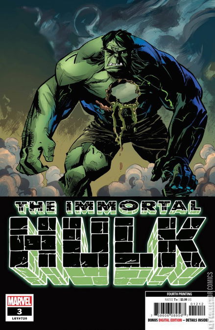 POINT OF VIEW What happened in the church on Mercer Avenue? What made the Lembert boy do what he did? Who is the One Below All? Reporter Jackie McGee has four eyewitnesses, with four different viewpoints, telling four different stories. But they all saw Bruce Banner…and the Immortal Hulk. LEGACY #720 Leonardo Romero's segment is based on the classic superhero style. Paul Hornschemeier's segment is meant to be reminiscent of an indie style typical of the art-comix from the 1990s. This issue's format was inspired in part by an episode of the Italian strip Il Commissario Spada in which involved the titular policeman chasing a purse-snatcher and asking various witnesses about him, with each witness describing him differently, accompanied by a visual sketch of what they're talking about, while the actual perp looks totally different. Per Al Ewing's note to his editors (reprinted in Immortal Hulk Director's Cut #3), the story is told in five distinctive styles: regular, super hero, indie, romance old-school horror. This issue's cover is an homage to Curtis magazine Hulk! #13. 1st mention of the One Below All Circulation: 44,389
