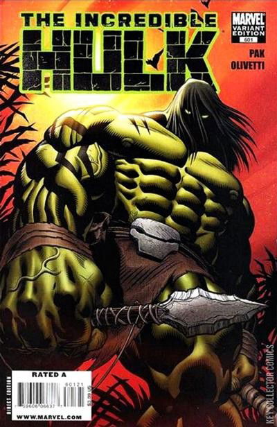 Cover by ARIEL OLIVETTI. Written by GREG PAK and FRED VAN LENTE. Art by ARIEL OLIVETTI and MICHAEL RYAN. Gamma fans rejoice -- the rumors are true! The INCREDIBLE HULK book returns as an ongoing series written by acclaimed PLANET HULK and WORLD WAR HULK scribe Greg Pak! Get ready for Bruce Banner as you've never seen him, the Son of Hulk in a whole new world of smash, and an insane new adventure that changes everything for everyone's favorite Green Goliath! With art by Ariel Olivetti (CABLE) and introducing a new, regular bonus backup SAVAGE SHE-HULK story written by Fred Van Lente and drawn by Michael Ryan! Continuity Notes Banner's Back The Hulk's exile in space (Incredible Hulk (Vol. 2) #91–105) and his subsequent war on New York City (World War Hulk #1–5) are recounted in this story. Mr. Fantastic points out to Bruce Banner that he is lucky that Norman Osborn is out of town. Osborn became a hero after killing the leader of the Secret Invasion in Secret Invasion #8. He took over as director of SHIELD, renaming it HAMMER. The battle between the Hulk and Skaar is also recounted here. Their conflict was in Planet Skaar Prologue #1 and Skaar: Son of Hulk #11–12. Bruce Banner states that he had been away from Earth for an entire year before the Hulk came back from Sakaar. However, per the Sliding Timescale of Earth-616, the length of time between Incredible Hulk (Vol. 2) #92 and this story would be measured in months, making that time less than a year. One could presume that time on Sakaar ran faster than it did on Earth. Banner points out that Tony Stark is not around. That's because Tony is on the run from the law since Norman Osborn took over SHIELD, as seen in Invincible Iron Man (Vol. 2) #8. Banner's prediction that the Hulk will return comes true, as seen in Incredible Hulk #610. The armor Banner is wearing to fight Skaar was the same suit that Banner designed in Tales to Astonish #60–61. Bruce Banner mentions that he killed his own father. This was revealed in Incredible Hulk #-1. Clash of the Furies: She-Hulk went missing following the events of last issue. Lyra mentions how She-Hulk came to her aid in the past. That happened in All-New Savage She-Hulk #1–4. Legacy Numbering Based on the Marvel Legacy renumbering infographic, this issue is actually Incredible Hulk Vol 1 600. A different editorial count resulted in its publication as Vol 1 #601. Other Notes 1st team appearance of the second Gamma Corps: Aberration, Axon, Morass Cover has a white background and a border of a number of Marvel characters that is a tribute to the Marvel 25th Anniversary border which appeared on most Marvel books from November 1986.
