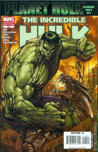 A special, HULK-sized issue commemorating 100 issues of gamma-irradiated goodness with two big stories: Planet Hulk, Allegiance, Part 1 ? Is he the Sakaarson, destined to save the planet from its greatest enemies, or the Worldbreaker, the legendary destroyer of everything? The HULK continues his epic story on Planet Sakaar. In this issue, the HULK and Caiera the Oldstrong lead their warriors in an all-out battle against the horrifying Spikes. But even with the Hulk growing stronger, how can he and his warriors prevail against an enemy that consumes and possesses everything it touches? Featuring another shocking development in the story of Miek ? and further hints about the identity of the Sakaarson ? and the Worldbreaker. Plus, a 12-page back-up featuring the return of one of HULK?s greatest artists, Gary Frank, as someone discovers that the Illuminati were responsible for sending the Hulk into space! Also reprints Incredible Hulk (vol. 1) #3 and #152!
