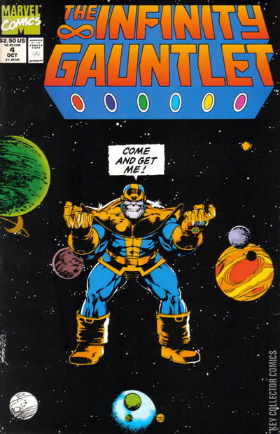 "Cosmic Battle on the Edge of the Universe!" It's Captain America, Iron Man and the other greatest champions of Earth taking on Thanos, who possesses the Infinity Gauntlet. And the heroes...lose?!? But what plan do Adam Warlock and the Silver Surfer have to defeat Thanos?Earth's heroes have descended upon Thanos is a attempt to defeat his maniacal plots. They are simply no match for Thanos and the Infinity Gauntlet. Mephisto points out that Adam Warlock and Silver Surfer are not engaging in the battle.Thanos realizes, with the manipulation of Mephisto, that he cannot impress Death with the full abilities of the gauntlet. He must show courage in the face of his enemies. He turns off all the gems power except the Power Gem to even the playing field. He still has limitless power just no cosmic awareness.Even in the limited state he has placed himself in Earth's heroes are no match for him but have a better chance. The might of Hulk and Drax are still not enough. Under Captain America's leadership they seem to have some hope.The Surfer is growing impatient. Warlock has not yet revealed his plans for the Surfer, so that Thanos cannot steal those plans from his mind.Thanos dispatches of She Hulk and Namor by encasing them in stone. He blasts Doctor Doom, whose only goal is to get the Infinity Gauntlet for himself. Thunderstrike puts up a challenge for Thanos but it's still not enough. Wolverine gets the drop on Thanos and buries his claws into Thanos' chest, but even this proves not to phase him. One by one they all fall to Thanos. Thunderstrike is turned into glass and broken, Cyclops is suffocated and he turns Nova into toy blocks. Spider-Man and Iron Man are killed by Terraxia. Quasar is defeated under Thanos' power.The final combatant is Captain America who still stands to fight. Thanos shatteres his shield in one blow. As he goes to finish him off, Warlock and the Surfer make their move. But Thanos is aware of them and the Surfer cannot manage to take the gauntlet from him.Now the big guns arrive to battle, the...