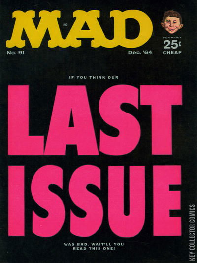 Home / EC / Mad / Mad #91 EC Released December 1964 Mad #91 Add to Collection Want It Synopsis No synopsis available. Issue 92 of 547 Add to Collection Buy it on eBay Buy on eBay Low $5 Mid $18 High $60 Synopsis No synopsis available. Details Series Mad Cover Date December 1964 Pages 52 UPC N/A Cover Price $0.25 Final Order Cutoff N/A Creators No creators listed. Price Guide Log in or subscribe to access detailed graded price information and market insights. Log In Subscribe