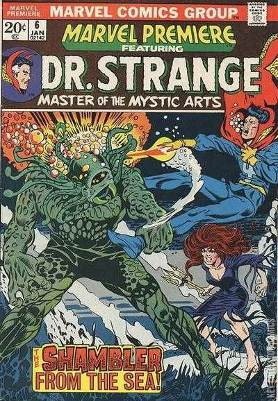 "The Shambler from the Sea!" - Strange frees himself from the crevasse and the onrushing waters, but he must face Sligguth again and in his own territory. The good doctor emerges victorious, the ancient Sligguth sunken dead to the bottom of the waters. Unfortunately, this only brings rise to the next powerful minion of Shuma Gorath, N'Gabthoth. Making matters worse Clea, Wong arrive in town and are quickly captured.