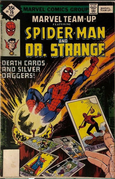 IF NOT FOR LOVE It is Saturday night, and Spider-Man is enjoying himself swinging across Washington Square. Soon he passes by Dr. Strange's Greenwich Village sanctum, and the mystic master sees him through a window. Strange wonders what brings Spider-Man into the neighborhood and calls out to him, but Spider-Man seems preoccupied and does not respond. Strange thinks Spider-Man's appearance is more than coincidence, for just this morning he received a deck of tarot cards by special delivery, with no return address. It was an ancient deck, heavily charged with power, and as soon as he touched it he felt compelled to do a reading, even though he had not done one in years. The ten cards are still laid out on a table, and as he returns to contemplate them, Clea enters the room. She tries to distract him, but he is far too busy trying to penetrate the arcane forces that seem to be clouding his perception. Clea is annoyed that Strange is excluding her from his work, and as they leave the room quarreling, neither one notices that Dr. Strange's Orb of Agamotto has begun to glow. A few blocks away, Spider-Man finds an alley and changes into his street clothes, wondering why his spider-sense started to tingle. Trying not to think about his studies, he starts to walk back toward Dr. Strange's house, still too preoccupied to care about where he is headed. At the same time, having calmed Clea down, Dr. Strange returns to once more contemplate the tarot layout, but he still fails to note the glowing Orb behind him. Near Abingdon Square, a few blocks away, Carol Danvers, editor of Woman magazine, disembarks from a bus. Having spent thirty hours working without a break to get the latest issue to the printers, she is looking forward to a hot bath. Unfortunately, a rude man behind her pushes her out onto the sidewalk, and she stumbles into Wong, Dr. Strange's servant, who is homeward bound with groceries. She recognizes him, but he does not know her and introduces himself, and she helps him pick up the provisions. Meanwhile, Dr. Strange continues to contemplate the tarot, but when Clea looks in on him she finds his study cold and the air reeking of evil. Then she sees the glowing Orb and shouts a warning, but before Strange can react, a demon form erupts from the object and attacks. Ectoplasmic tentacles hit Dr. Strange like steel bars as the monster attacks his mind. Strange utters a spell, but it has no effect, and when Clea begins to scream, the telepathic rapport Strange shares with his disciple transmits her agony, and he feels her soul wrenched from her. As Carol Danvers finishes repacking Wong's shopping bag, he suddenly receives a mental alarm from Dr. Strange and rushes away. Carol realizes something is wrong and follows him, and when he runs by Peter Parker, Peter's spider-sense tingles a strong warning. Peter recognizes Wong, and he quickly ducks into an alley, changes into his Spider-Man costume, and follows Wong to Dr. Strange's sanctum. The first bad sign Spider-Man notices is that the door is unlocked, which means that Strange's mystic defenses are down. Finding the first floor empty, he rushes upstairs, noting that the interior of the house seems a lot larger than it looks from outside. Finally he reaches Strange's study, where he finds Wong staring in shock at the unconscious forms of the mystic master and his disciple. As Wong and Spider-Man whisper together, Spider-Man's spider-sense starts to tingle, and he turns to see Ms. Marvel behind him. Her costume has changed since Spider-Man last saw her, and at first he does not recognize her. Just then Dr. Strange very weakly asks for Wong, and Ms. Marvel tells Spider-Man to take Strange into the next room while she takes care of Clea. Sometime later, in the library, Dr. Strange restores his strength with a Spell of Rejuvenation. With Clea's life at stake, he explains, he does not have the time to recover naturally. Unfortunately, he cannot use the Spell of Rejuvenation on Clea, because her soul has been torn from her body and is now imprisoned in the mystic Orb of Agamotto. Strange's strongest spells have failed to bring her back. It is imperative that they rescue her quickly, he continues, lest the realm of unreality within the Orb drive her mad or kill her. The tarot cards he received earlier that day were clearly sent to warn him about this, says Strange, and the only clue they have about the sender is the postmark — New Orleans. Spider-Man replies that black magic has always been out of his league and starts to leave, but Dr. Strange persuades him to stay. Then Strange casts a spell, and he, Spider-Man, and Ms. Marvel vanish, leaving Clea's body lying on a bed in the care of Wong. Soon the three companions materialize on Bourbon Street in New Orleans's fabled French Quarter, much to the astonishment of two tourists, Billy and Lode. Strange magically erases the tourists' memory and quickly casts a spell to disguise himself, Spider-Man, and Ms. Marvel as ordinary people. Then Strange detects an astral energy trail leading out of the city into the bayou country along the Mississippi River. Whoever sent the cards is making it very easy to find him, says Strange as they approach an isolated shanty. The dilapidated appearance of the structure, however, belies the ornate and beautiful interior they see when they enter. A woman seated at a long table welcomes them and tells Strange to "enter freely and of his own will." When Strange asks her who she is, she says she is Marie LaVeau, the Witch-Queen of New Orleans. Dr. Strange can see that Marie LaVeau is contemplating a tarot-card layout identical to the one he laid out in New York. He senses power in the woman, but no threat. Then he asks what part she plays in this "nightmare," and she replies that it was she who sent him the warning, as a friend. She explains that his being there means her warning came too late. As the cards foretold, she continues, he has fought malign magical forces and lo