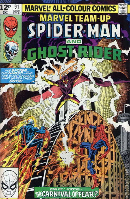 CARNIVAL OF SOULS! Peter Parker and Gloria Grant are at a carnival in Connecticut. It is the last day of the carnival season, and thousands of New Yorkers are taking advantage of the balmy weather for an end-of-summer fling. Peter is glad Gloria talked him into going because he has had a delightful time. A series of colorful posters and a loud barker attract them to a freak show, and Peter pays two dollars to enter. Onstage is a man dressed in a Man-Thing costume, who is introduced by a turbaned figure as the "muck monster." The audience is completely taken in by the fraud. Then the exhibitor introduces a creature called the Blazing Skull, who is apparently a fleshless skeleton wrapped in flame. This time, the audience thinks he is an obvious fake and starts to boo, but when a thrown popcorn box passes through the skeleton's rib cage and ignites, Peter realizes that the figure is real. In fact, he is none other than the Ghost Rider. Peter stands up and demands to know what the motorcyclist is doing in the sideshow. But the exhibitor yells for help, and in seconds several burly carnival men escort Peter and Gloria out of the pavilion. Meanwhile, the blazing figure on stage hesitates as if trying to remember something, something about the name "Ghost Rider." But the exhibitor soothes the flaming skeleton and tells him to leave the stage. The performance is over. Peter and Gloria are taken none too gently to the carnival entrance by a pair of silent roustabouts, and Peter is thrown to the sidewalk. Gloria shouts that she will sue the carnival, but Peter calms her down. Then she says there is something strange going on, and Peter recalls to himself that when the roustabouts grabbed him, he fought back with his spider-strength and they did not even feel it. As they catch a train back to New York, Peter decides to visit the carnival later that night as Spider-Man. Shortly after midnight, Spider-Man climbs to the top of the roller coaster and scans the fairground. There is not a soul in sight, which he finds odd because he expected people to be taking down the tents and getting ready to move on. Had that man not become so upset, he muses, he would not have bothered to come back. As he climbs to the ground, he senses danger, and his Spider-Signal spotlight illuminates a trio of growling guard dogs. Baring their teeth, the canines leap, but he webs up two of them and knocks the third unconscious. Then a voice behind him congratulates him on his victory: Startled, Spider-Man turns and sees the exhibitor and the rest of the carnival. The man assures Spider-Man that he will not find his "army" as easy to stop as the dogs because they feel no pain and will keep coming until he is defeated. He is glad to see his "old foe," he continues, because it saves him the trouble of hunting him down. Spider-Man says he has never seen him before in his life. Then his spider-sense starts to tingle, and one of the freaks from the show—the six-armed "Spider-Man"—drops down on him. But Spider-Man somersaults out of his grip onto the latticework of the roller coaster several feet off the ground. He is puzzled that the carnival people say nothing and make no move toward him, as if they are waiting for something. Then a ball of flame appears in front of him, and the Ghost Rider, fully attired in his leather outfit, steps from the shadows. The air is redolent of brimstone as Spider-Man tries to web the fiery figure up, but his webbing melts when it hits the flame. Spider-Man tries a frontal assault, but the Ghost Rider easily repels him. The turbaned man asserts that Spider-Man is beaten. If he continues to struggle, he says, he will earn a most painful death. Naturally, Spider-Man ignores him and starts to climb up the roller coaster. The man sends his slaves after Spider-Man, and they get in the roller-coaster car and start it up, eerily silent throughout. Then the man commands the Ghost Rider to create his flaming motorcycle and drive up the other side of the coaster. The car reaches Spider-Man first, but he slows it down with webbing and derails it. To avoid injuring the workers, he catches them in a web-net as they fall. Then the Ghost Rider arrives. Spider-Man tries to leap out of his way, but the Ghost Rider does a wheelie and hits Spider-Man in mid-leap. Spider-Man falls, but then he snags the coaster with webbing, swings around, and slams into the Ghost Rider with both feet. Then the Ghost Rider touches him lightly with his hellfire. The coldness of the sensation is overwhelming, and Spider-Man hits the ground hard. He tries to stand, but a carnival worker knocks him out with a club. When Spider-Man awakens, he finds himself chained to a wall in a well-furnished carnival wagon. A brazier burns on the other side of the room. Strangely, the interior of the wagon seems much larger than it appears from outside. He tests his bonds, but they hold firm. After a few minutes, the turbaned man enters. Spider-Man maintains that he has never seen him before, but the man gestures and reminds Spider-Man of San Francisco and the plunge from the Golden Gate Bridge. His gesture changes his features, and then Spider-Man recognizes him as Moondark the Magician. Spider-Man derides the evil-doer, but Moondark extends his hand to display his ring, wherein can be discerned the features of Johnny Blaze, alter ego of the Ghost Rider. The soul of Johnny Blaze is trapped in the ring, says Moondark. Then he tells Spider-Man what happened to him after he fell from the bridge. The fall did not kill him, he begins, because the Dark Beings that he worshiped carried him away. He pleaded for his life, much to their amusement. They did allow him to live, but they stripped him of his soul. Soon he was back on Earth and found this carnival, which needed a magic act. He earned his keep by dazzling audiences with parlor tricks, but his real task was to steal souls with which to redeem his own. He created a nearly indestructible Soul Orb out of th