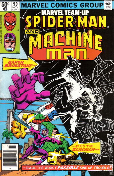 AND MACHINE MAN MAKES 3 Bored with preparing for the next day's tutorial, Peter Parker decides to don his Spider-Man costume and web-swing out over the city. Meanwhile, at Ryker's Island Prison, two guards watch with amusement as the Sandman struggles to escape from a "flowing plexiglass bubble" designed by Reed Richards. Quite transparent, the elastic bubble easily withstands The Sandman's strongest blows while containing all of his body's sand grains. Making his rounds in another section of the prison, a guard named Grant Stevens passes by the cell of Machine Man's old enemy, Baron Brimstone. A skillful illusionist, Brimstone quickly hypnotizes Stevens into releasing him and accompanying him to the property office. There Brimstone exchanges his prison clothing for his magician's costume. A few moments later, much to the surprise of the onlooking guards, Brimstone emerges from a puff of smoke in the Sandman's cell. Stunning the guards with energy bolts, the red-bearded criminal greets the astonished Sandman. When one of the guards pulls out his pistol, Brimstone disables him with another energy blast. Then he hurriedly requests the Sandman's aid in a "matter of personal vengeance," and the Sandman quickly agrees.�� A gesture from the magician causes the Sandman's plexiglass bubble to vanish, and the two criminals teleport away in another puff of smoke. Seconds later, they materialize in front of Brimstone's huge Upper Westchester mansion. Brimstone's display truly impresses the Sandman, and Brimstone declares that he has become reasonably competent in the mystic arts after years of study. Yet, he continues, he also uses advanced technology when necessary. The Sandman can see the teleportation device strapped to Brimstone's back when Brimstone removes his cape. When he asks whom Brimstone wants destroyed, the magician explains that Machine Man recently disrupted a highly profitable enterprise of his and so must pay for his impertinence. Then he remarks that Machine Man seemed inordinately fond of a Delmar Insurance Company file clerk named Pamela Quinn, and the Sandman immediately suggests kidnapping the woman to bait their trap. Together, gloats Brimstone, they will destroy the Machine Man. The next morning, as Peter heads to class at Empire State University, he hears a radio bulletin about the Sandman's escape. At the same time, in an East Side apartment, psychologist Peter Spaulding asks his roommate, Machine Man, whether he has heard the news. Yes, he replies as he attaches his human face to his head, his internal monitors picked up the bulletin. Thus disguised as Aaron Stack, he leaves for work, knowing that Baron Brimstone will find him before too long.�� Several hours later, at the Wall Street headquarters of Delmar Insurance, Eddie Harris approaches Pamela Quinn with another get-rich-quick scheme. He has learned from his "financial advisers" that a certain football quarterback is going to deliberately lose his game, and he says they can "clean up" on the point spread. Pamela quickly declines, and Harris is equally unsuccessful with Aaron Stack. Seconds after the disappointed Harris departs, Baron Brimstone and the Sandman emerge from a puff of smoke in the middle of the office. Delmar's employees run for cover as the two criminals search for Pamela, wreaking havoc. The Sandman soon spots her, but Stack warns her to duck under a desk and then leaps at the criminal. A powerful punch hurls Stack through two walls, and when he comes to rest beside the building's outer wall, he quickly changes into Machine Man.�� Just then Spider-Man web-swings by. When his spider-sense tingles, he crashes through the Delmar office window and dives toward the Sandmanjust as Machine Man attacks from the opposite side. The Sandman ducks and Spider-Man and Machine Man collide. Seeing Spider-Man, Brimstone recommends a strategic retreat, and the Sandman, having snatched Pamela in the meantime, orders Brimstone to teleport them out of there. This the magician does, though he is not pleased that the Sandman has started issuing commands. Each criminal silently promises himself to get rid of his partner at the first opportunity. As the Baron raises his smokescreen, Spider-Man recovers and sticks a spider-tracer to Pamela's dress. Machine Man tries to grab the criminals with his extended arms, but he is too late, and they and their victim vanish. Spider-Man and Machine Man, never having met before and knowing of one another only through unfavorable newspaper accounts, regard each other with suspicion. Then Spider-Man punches the mechanical man in the jaw, Machine Man retaliates with a punch of his own, and they start to battle. Machine Man tries to defeat Spider-Man to get him to listen to reason, and Spider-Man tries to disable Machine Man so he will not be a threat.�� They are, however, very evenly matched, and the battle continues for some time. Machine Man's internal heating units melt away Spider-Man's webbing, and Spider-Man's agility keeps him out of reach of Machine Man's extendable appendages. Then the telephone rings and Eddie Harris rushes from his hiding place to answer it, hoping that the caller is his football tipster. Machine Man hauls Eddie out of the way and at the same time punches Spider-Man, who lands on the telephone and shatters it, much to Eddie's chagrin. Then the robot wraps Spider-Man up in his arms. Noting that he could easily crush Spider-Man to a pulp if he chose to, Machine Man instead lets him go to prove his good intentions. This convinces Spider-Man, and he quickly apologizes for the trouble. Then the police arrive. Not wanting to become entangled with the law, the two crime-fighters agree to meet in a safer place, smash through the window and escape. A few minutes later, as Spider-Man hangs by a web-line from the cornice of a nearby building, he explains that he lost contact with his spider-tracer when Brimstone vanished. Machine Man quickly analyzes a duplicat